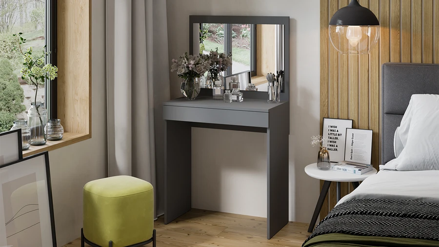 Несмотря на свои компактные размеры, туалетный стол имеет функциональный ящик с шариковыми направляющими для хранения парфюмерии, украшений и многого другого, достаточно вместительную столешницу, где можно разместить все необходимые аксессуары и полноценное зеркало. В этом туалетном столике нет ничего лишнего, только самое необходимое для уголка женской красоты.