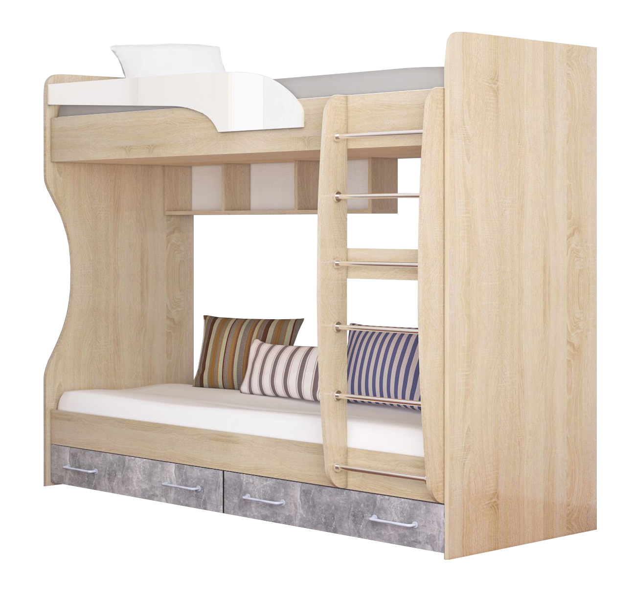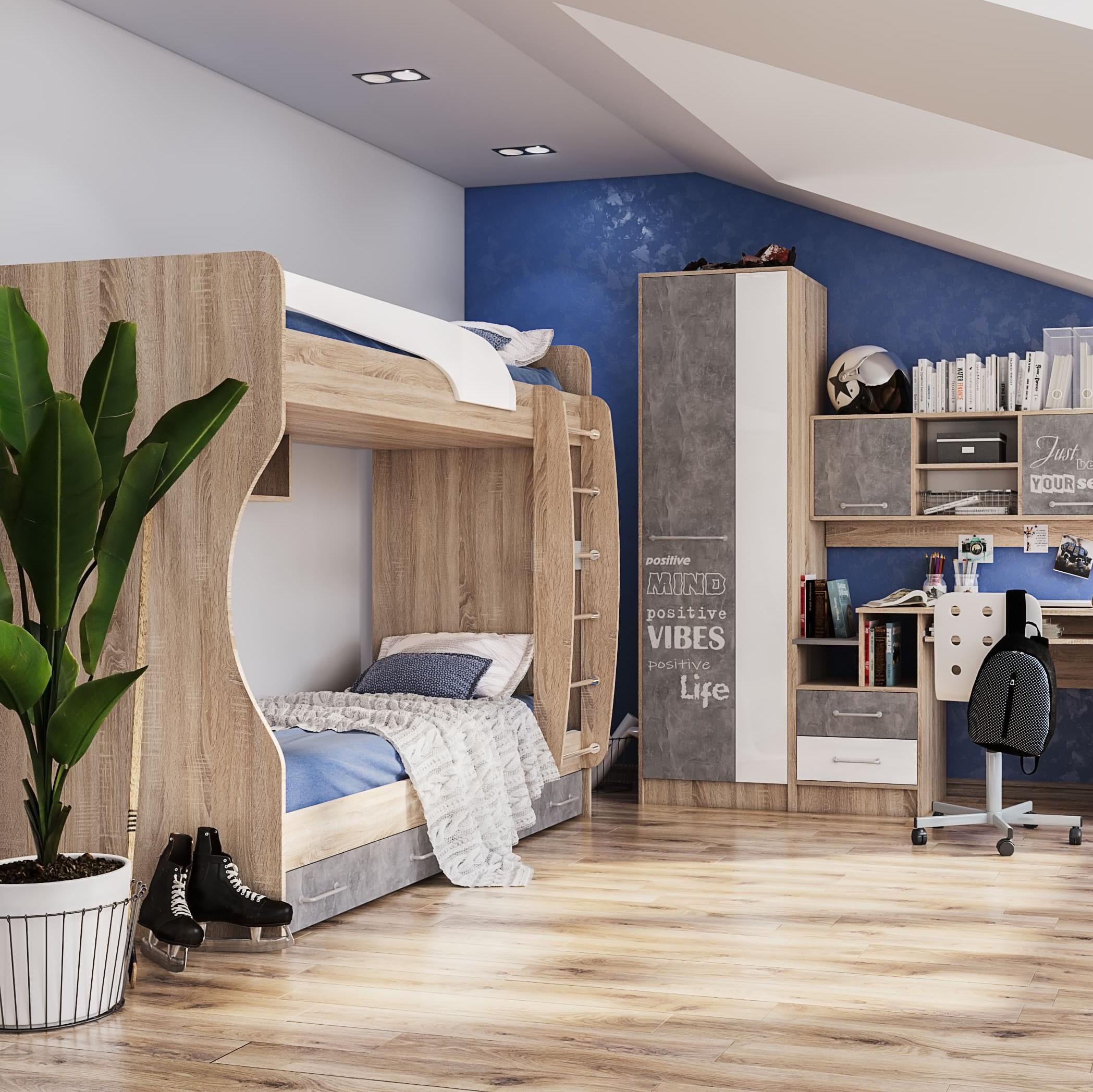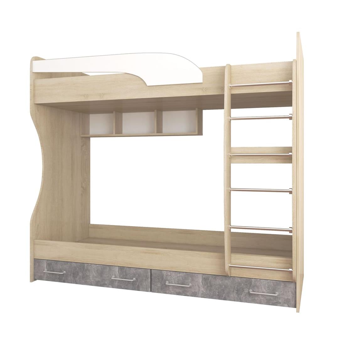 Эргономичная и невероятно надежная двухъярусная кровать КОЛИБРИ (дуб сонома / ателье светлое / акрил белый) — это идеальное решение для грамотного обустройства комфортной детской комнаты для двоих детей. Модель выполнена из качественного ЛДСП: теплый древесный корпус гармонично сочетается с выразительными фасадами в индустриальном декоре «ателье светлое» и белоснежными акриловыми вставками, что позволяет этой современной мебели для детской комнаты легко вписываться как в скандинавские, так и в лофт-интерьеры. При общих габаритах 1892х967 мм и высоте 1704 мм конструкция существенно экономит свободную площадь, предоставляя сразу два полноценных и безопасных спальных места размером 1860x800 мм. Если вы планируете купить детскую двухъярусную кровать с ящиками, данная модель станет исключительно рациональным выбором: в основании предусмотрены два вместительных выкатных отделения с надежными металлическими ручками, которые отлично подойдут для хранения постельного белья или игрушек. Удобная лестница и высокие защитные бортики верхнего яруса гарантируют спокойный сон и безопасность в эксплуатации. Ваше решение заказать двухъярусную кровать КОЛИБРИ — это залог безупречного порядка, долговечности и радости ваших детей от уютного личного пространства.