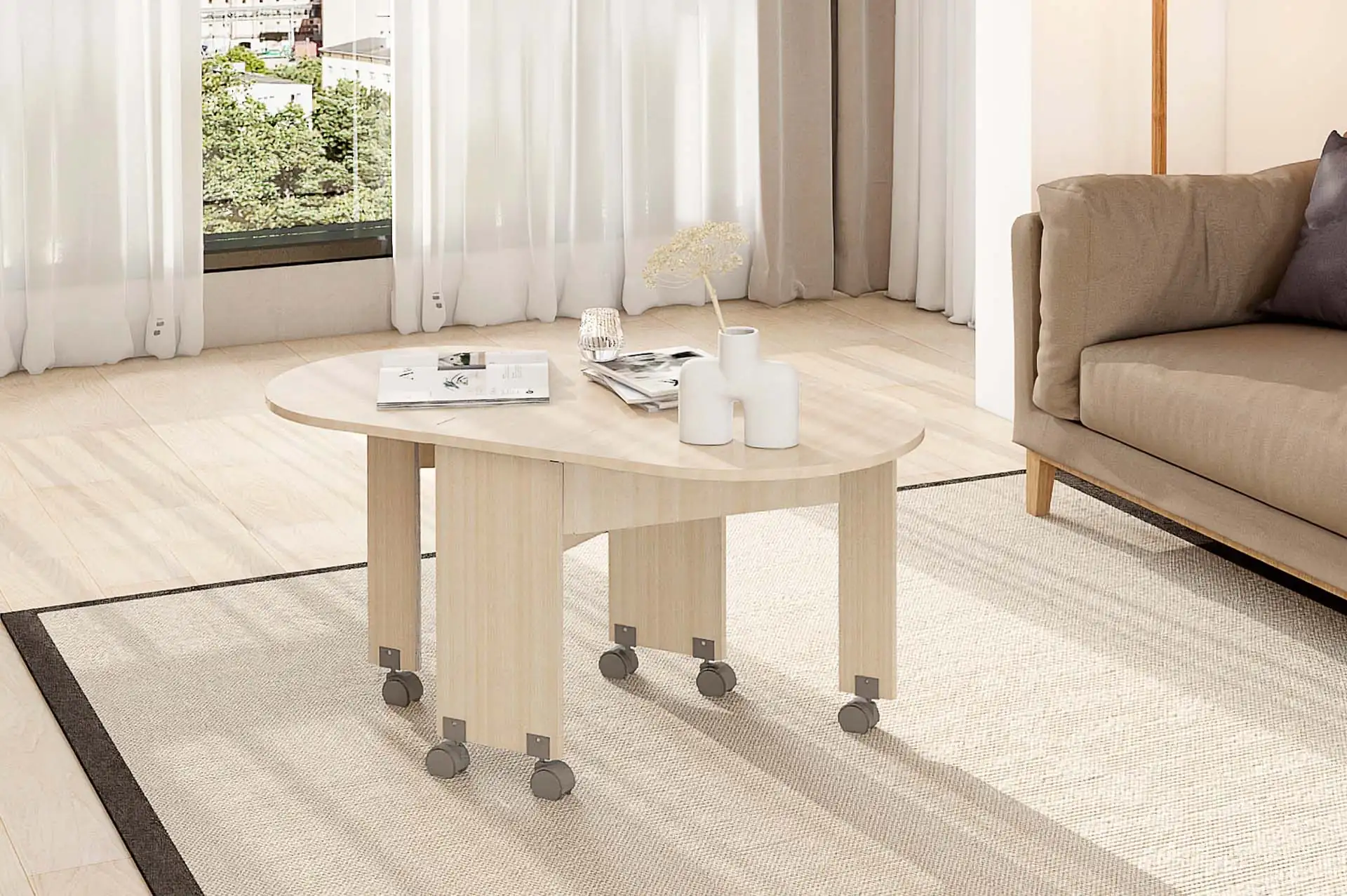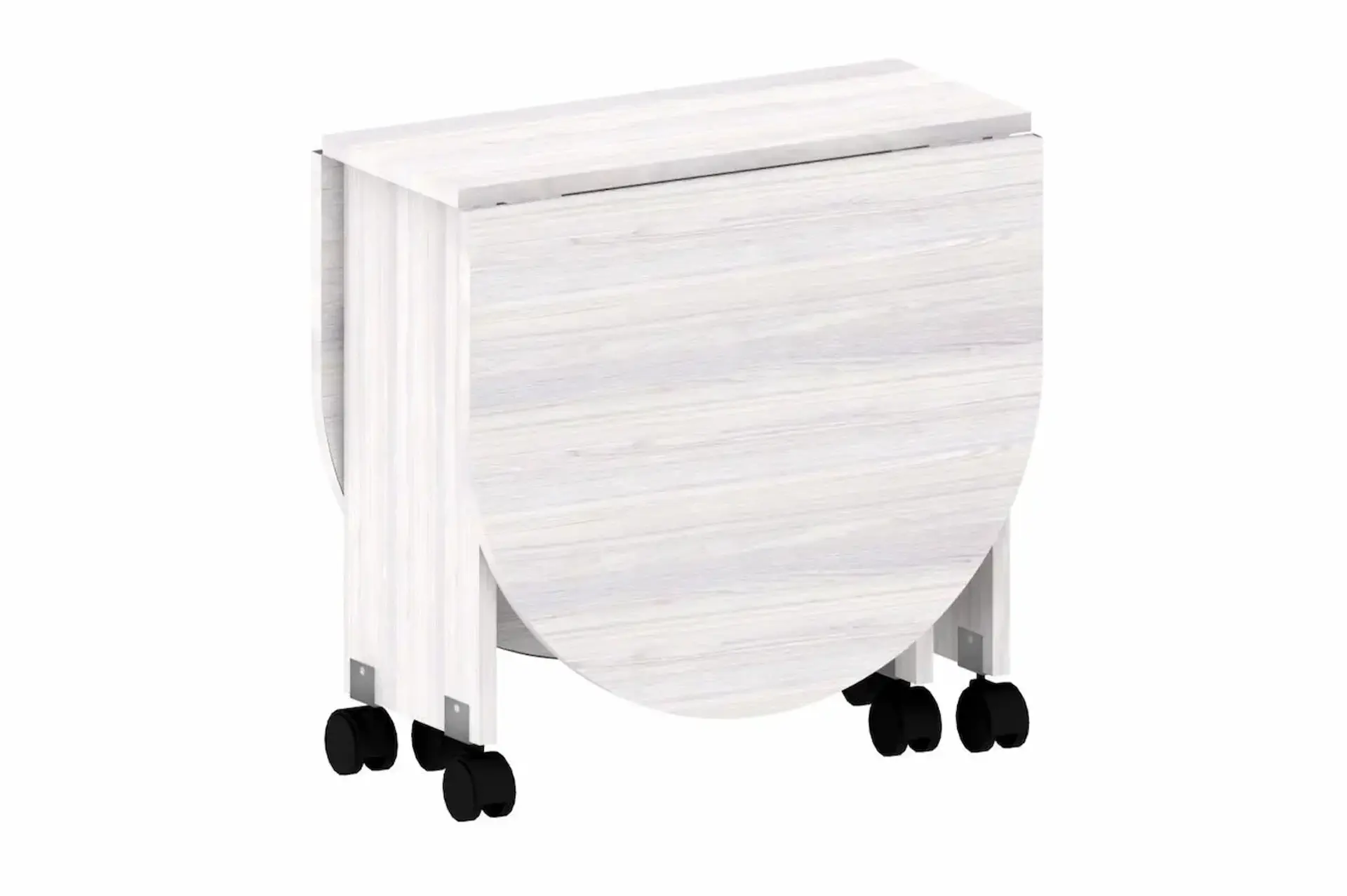 У нас есть великолепный стол-книжка, который неизменно пользуется популярностью. Для удобного перемещения по комнате стол оснащен колесными опорами.